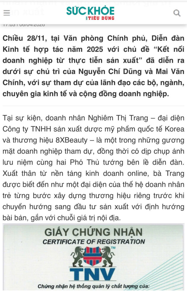 8X , khát khao mang đến giá trị, sự tự tin và sự thay đổi tích cực cho mỗi người. Nhà máy Korea nhanh chóng ghi dấu ấn vớicác sản phẩm chăm sóc sắc đẹp có chất lượng vượt trội, được sản xuất từ những nguyên liệu thiên nhiên an toàn, hiệu quả , là sự kết hợp hoàn hảo giữa yếu tố tự nhiên và công nghệ hiện đại. Nghiêm Thị Trang chú trọng vào việc cùng các bác nghiên cứu và phát triển các sản phẩm với công thức tối ưu, phù hợp với nhu cầu của thị trường Việt Nam và cả quốc tế. Cô không ngừng tìm kiếm và áp dụng những công nghệ mới nhất trong ngành mỹ phẩm để sản phẩm của mình không chỉ đáp ứng được yêu cầu về hiệu quả, mà còn mang lại cảm giác an toàn, dễ chịu cho người sử dụng.